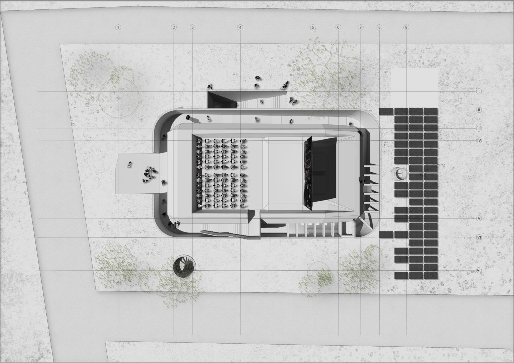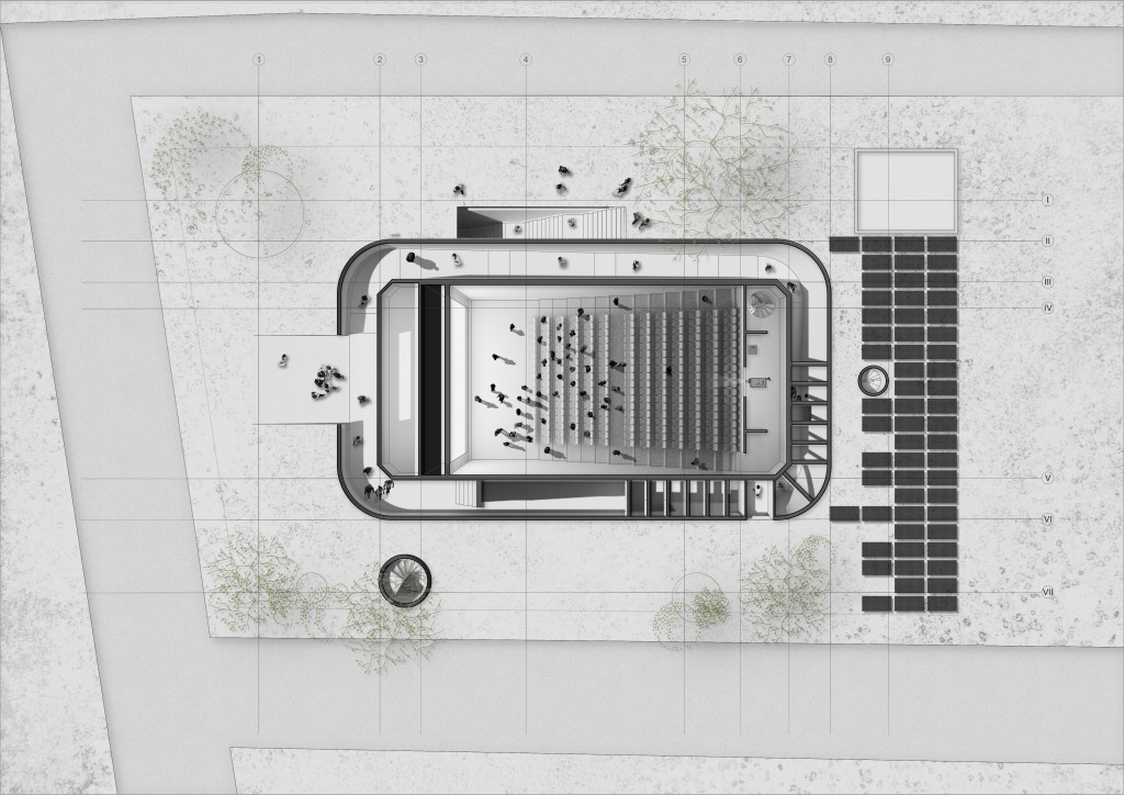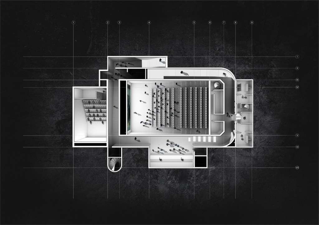 The cinema complex, designed as a robust concrete bunker, draws inspiration from the sturdy concrete silos that absorbed the impact of the blast. The exterior features a winding outdoor ramp that embraces the concrete walls, guiding patrons on a descent towards the underground cinema complex. This descent becomes a symbolic journey, inviting visitors to leave the external chaos behind as they move towards the cinematic sanctuary.