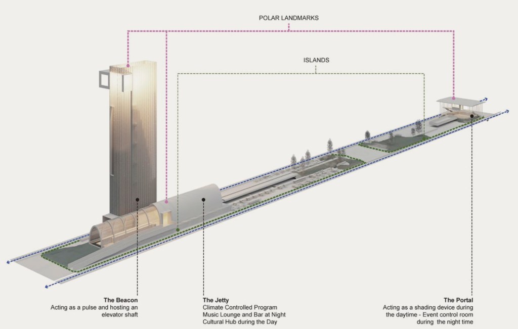 At the entrance of the street polar landmarks emerge. These iconic beacons not only draw attention but also act as entryways, attracting and filtering people from each end of the street.