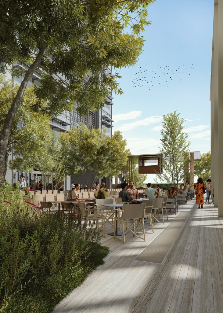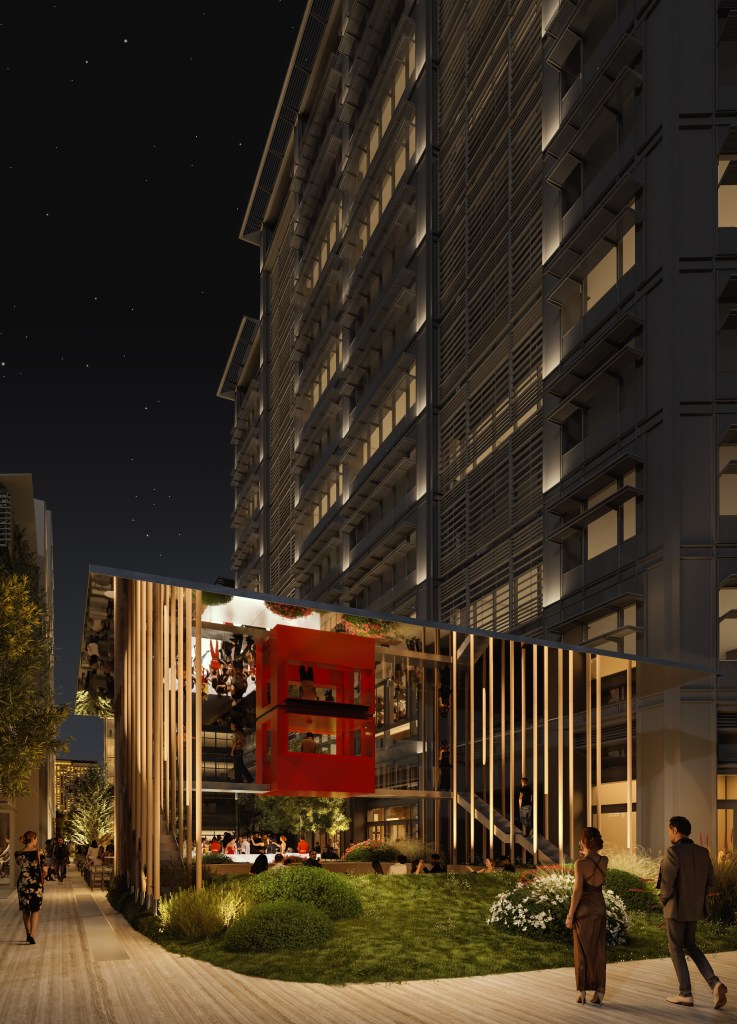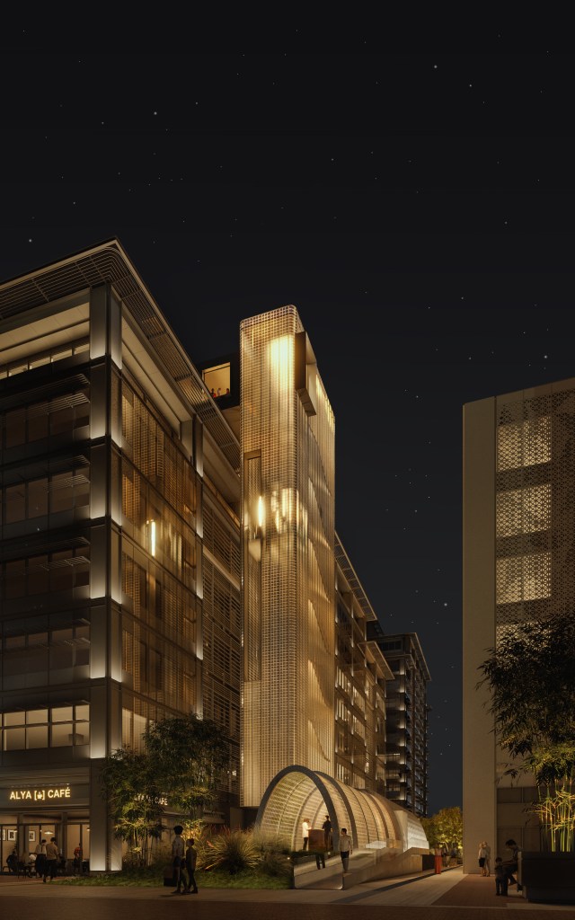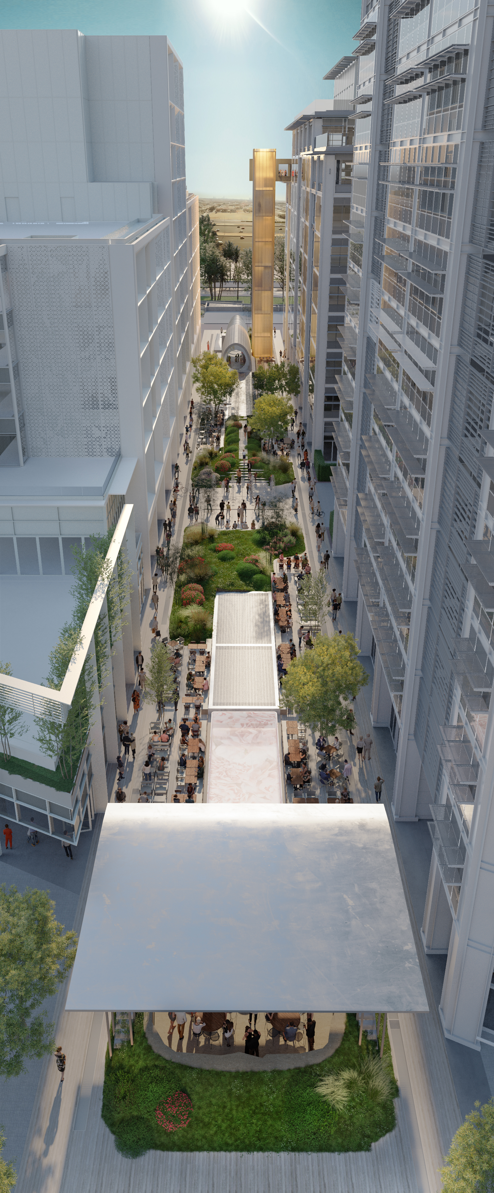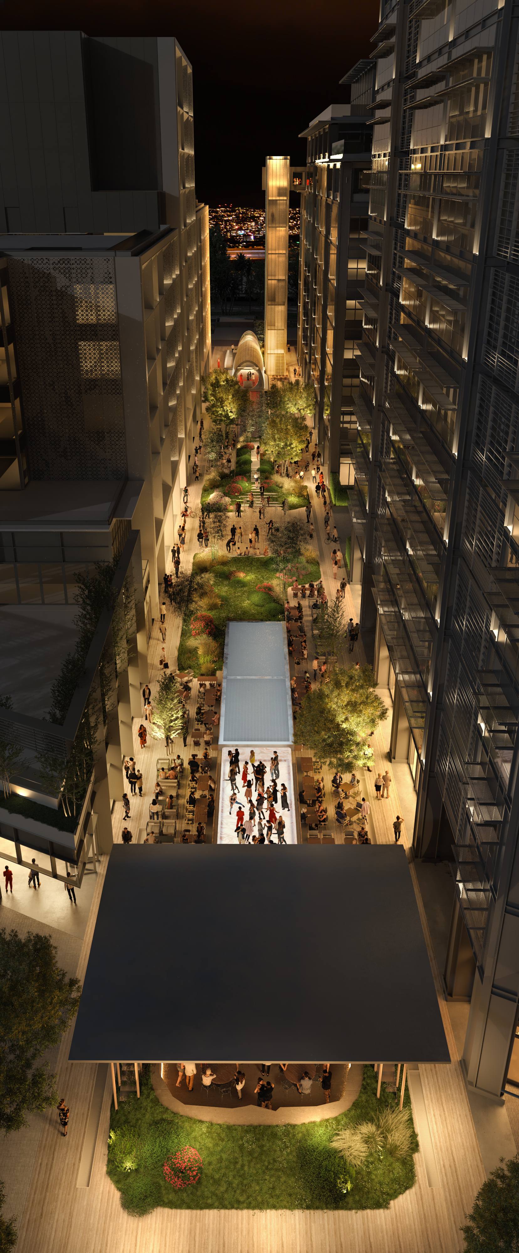 “The Urban Street” is conceived as a living, breathing entity, adapting to the changing needs and desires of its users. By day, it unfolds as a tranquil green park, providing a welcome respite for the surrounding office community. As night falls or festive seasons arrive, it transforms into a lively social hub, hosting outdoor nightlife events and open curated markets. The project’s core lies in the creation of two green islands, each create a natural transition, seamlessly integrating outdoor restaurant terraces and public seating, blurring the lines between nature and urbanity.
